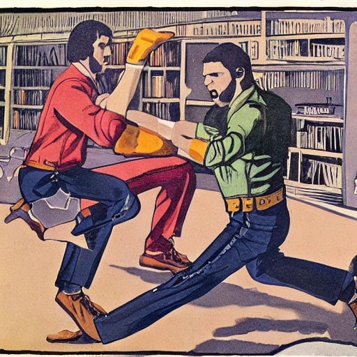 In my violent struggle, I hurl curses at the top of my lungs, which must cause some commotion, because suddenly a complete stranger appears and begins fighting by my side.